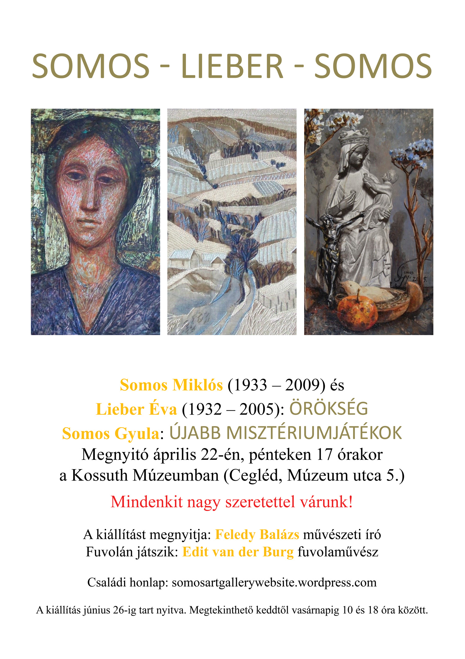 A művészcsaládban fölnőtt ceglédi festő „Örökség”-ével is megismerkedhetünk a Kossuth Múzeum következő kiállításán, ahol szüleinek munkásságát is bemutatja a ceglédieknek. Somos Gyula pedig legfrissebb alkotásait állítja ki „Újabb misztériumjátékok” címmel.